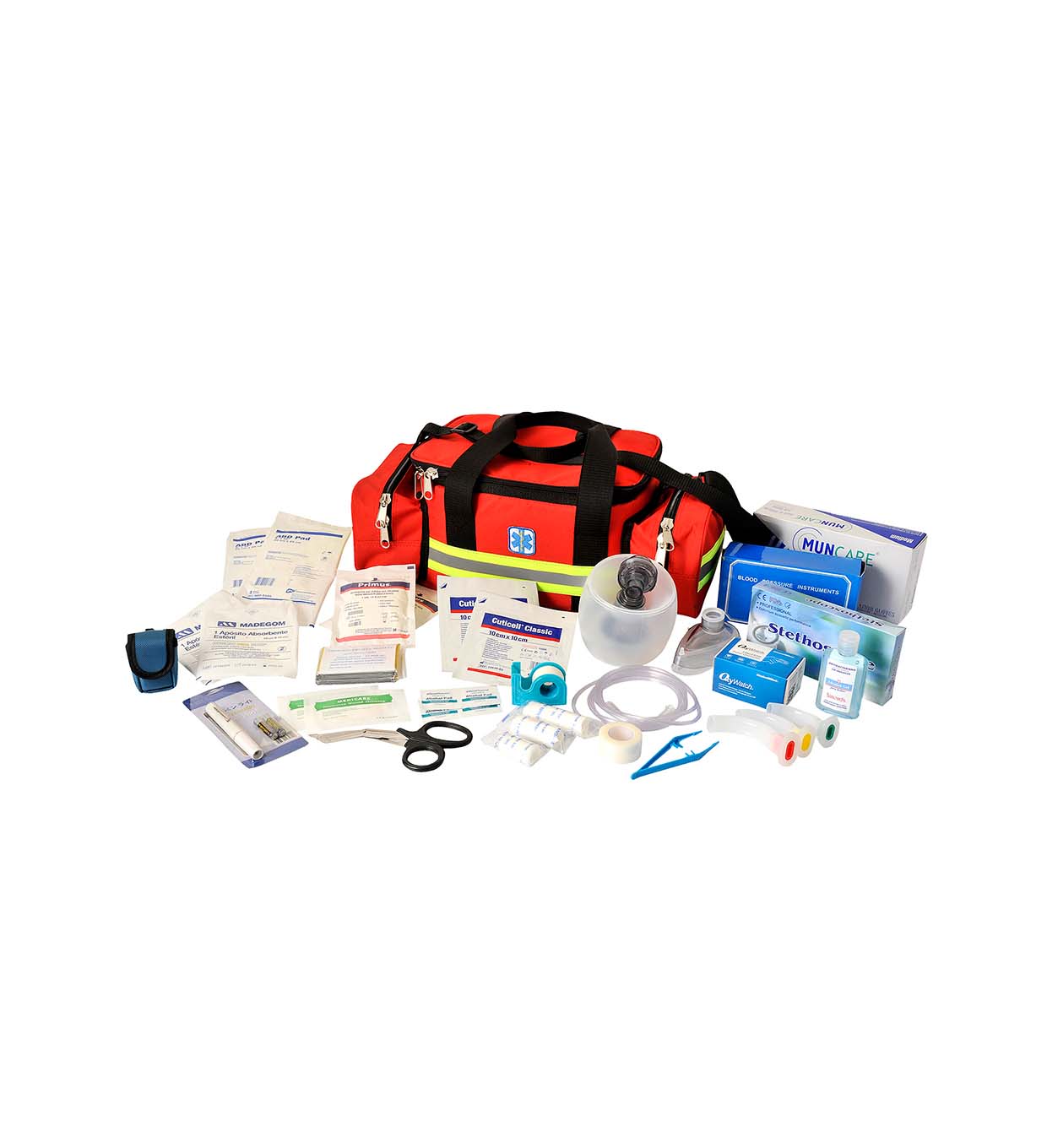Las costuras reforzadas y los cierres metálicos tipo YKK garantizan la seguridad del contenido almacenado. El logo bordado de cruz de la vida identifica claramente su propósito en situaciones críticas.
